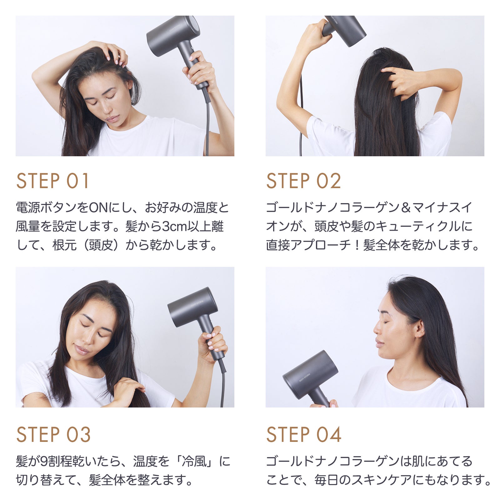 A.髪を乾かしながら、根元をふんわり&艶やかに仕上げるのに役立ちます。また、髪を乾かす度に、直接コラーゲンを浴びることになるので、髪だけでなくお肌のスキンケアとしてもご使用いただけます。