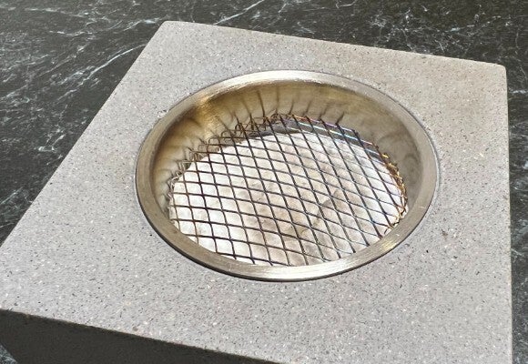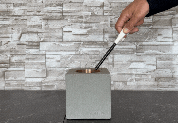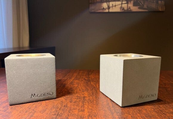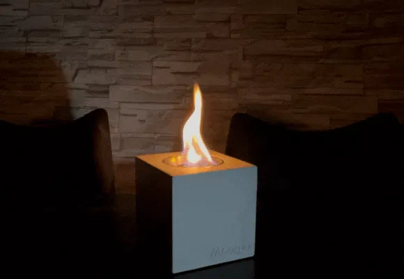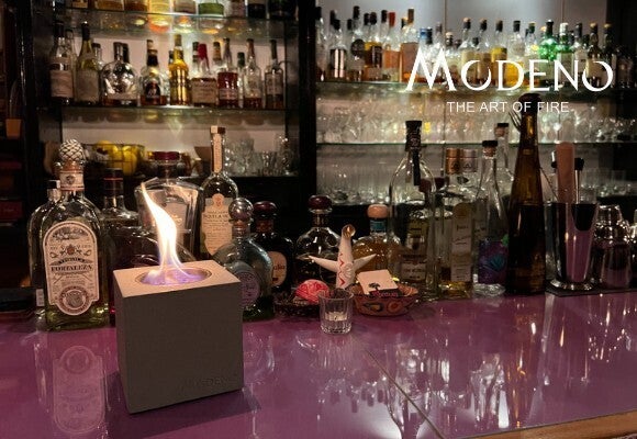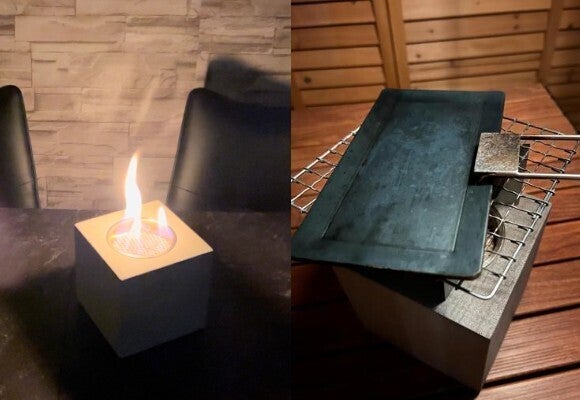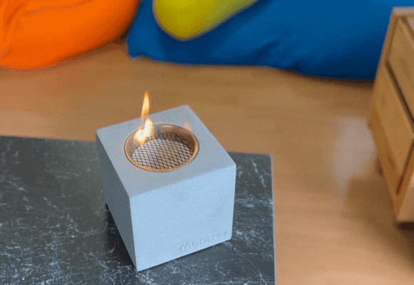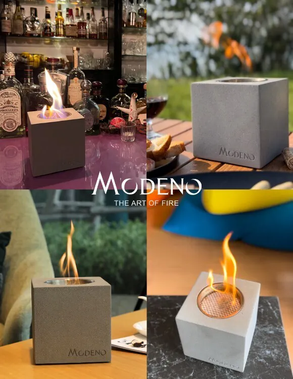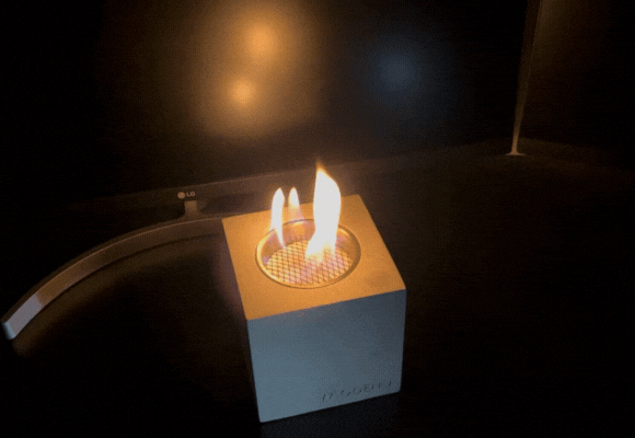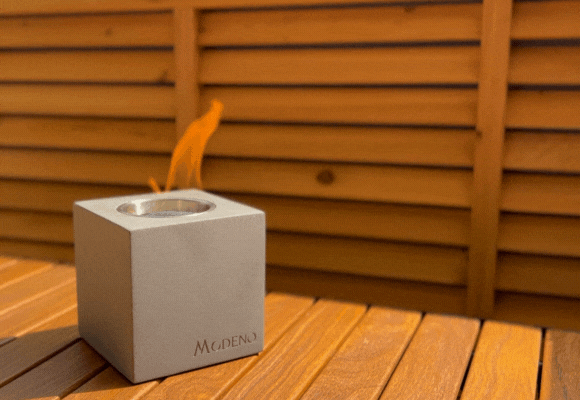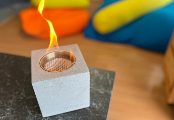MODENO VITO(モデノヴィトー)は煙も匂いもない新しい焚き火台。無機質なコンクリートからほむら立つ『本物の炎』は見る者に癒やしと安らぎを与えます。