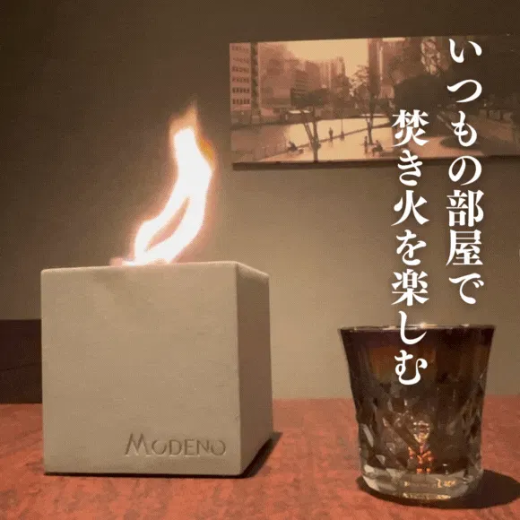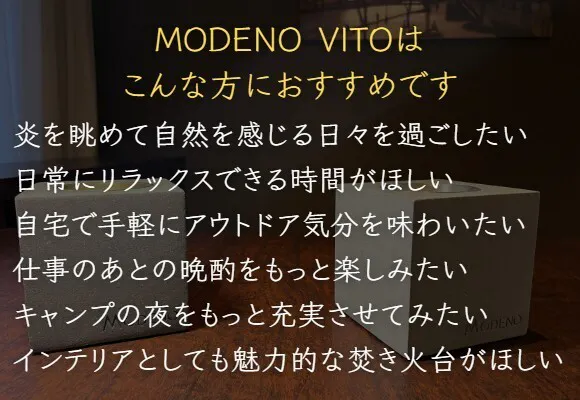 外で焚き火もいいけど時間がない、薪や焚き火台の置き場所もない。できれば涼しい部屋で楽しみたい、、そんなときこそMODENO VITOの出番です。