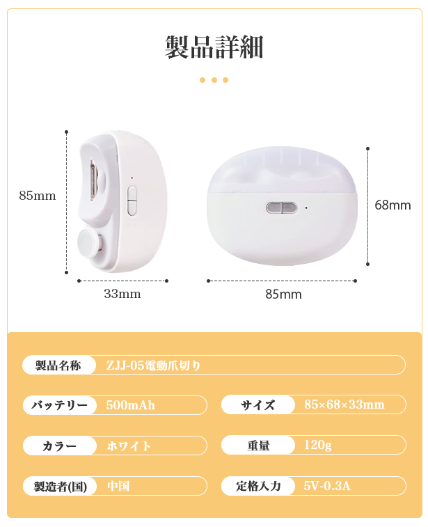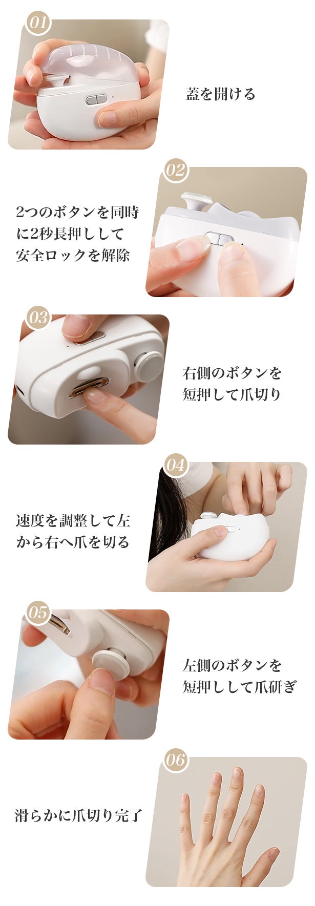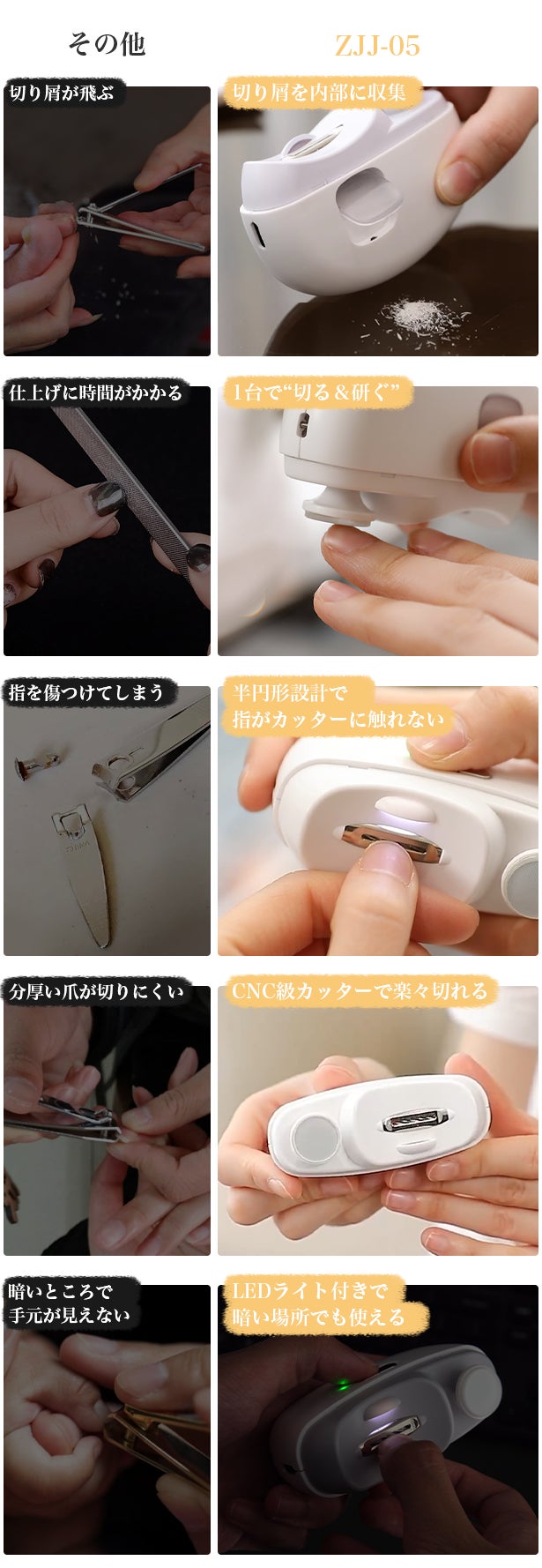 手動の爪切りは、切り過ぎてしまったり、指を切ってしまったりすることもありますよね。ZJJ-05は、このような問題を解決するために開発されました。