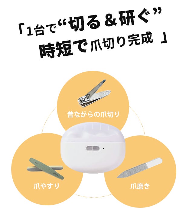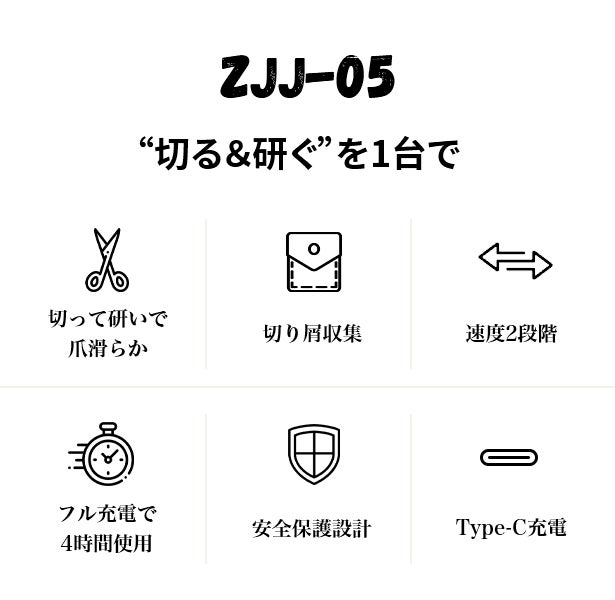 「ZJJ-05電動爪切り」は、どなたでも綺麗に爪をカットできるネイルケアグッズです。簡単操作で“切る&研ぐ”を楽々完了し、時間と手間を大きく省くことができます。また、爪を様々な形に仕上げることも可能です。