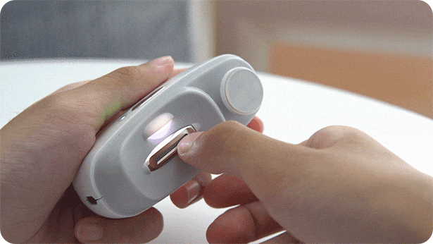 電源を入れるとLEDライトがオンになり、暗くて手元が見えにくいところでもお使いいただけます。例えば、夜赤ちゃんが眠っている間に爪を切ってあげたい、そんな時も部屋を明るくする必要はありません。