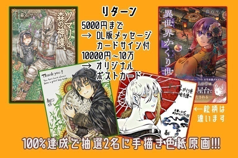 リターンは無事達成後にギガファイル便のリンクを貼ります。本当はアナログの紙で渡したいけれど大半がDLデータです。100%達成したらツイッターで抽選企画か、支援した人とコンタクトが取れればアナログ手描きの色紙を抽選した方にお送りします(ソマリ作品か、かくり世作品かどちらか一方は選べません ランダムです)そのほかの方はデータでDLしていただく感じになります。
