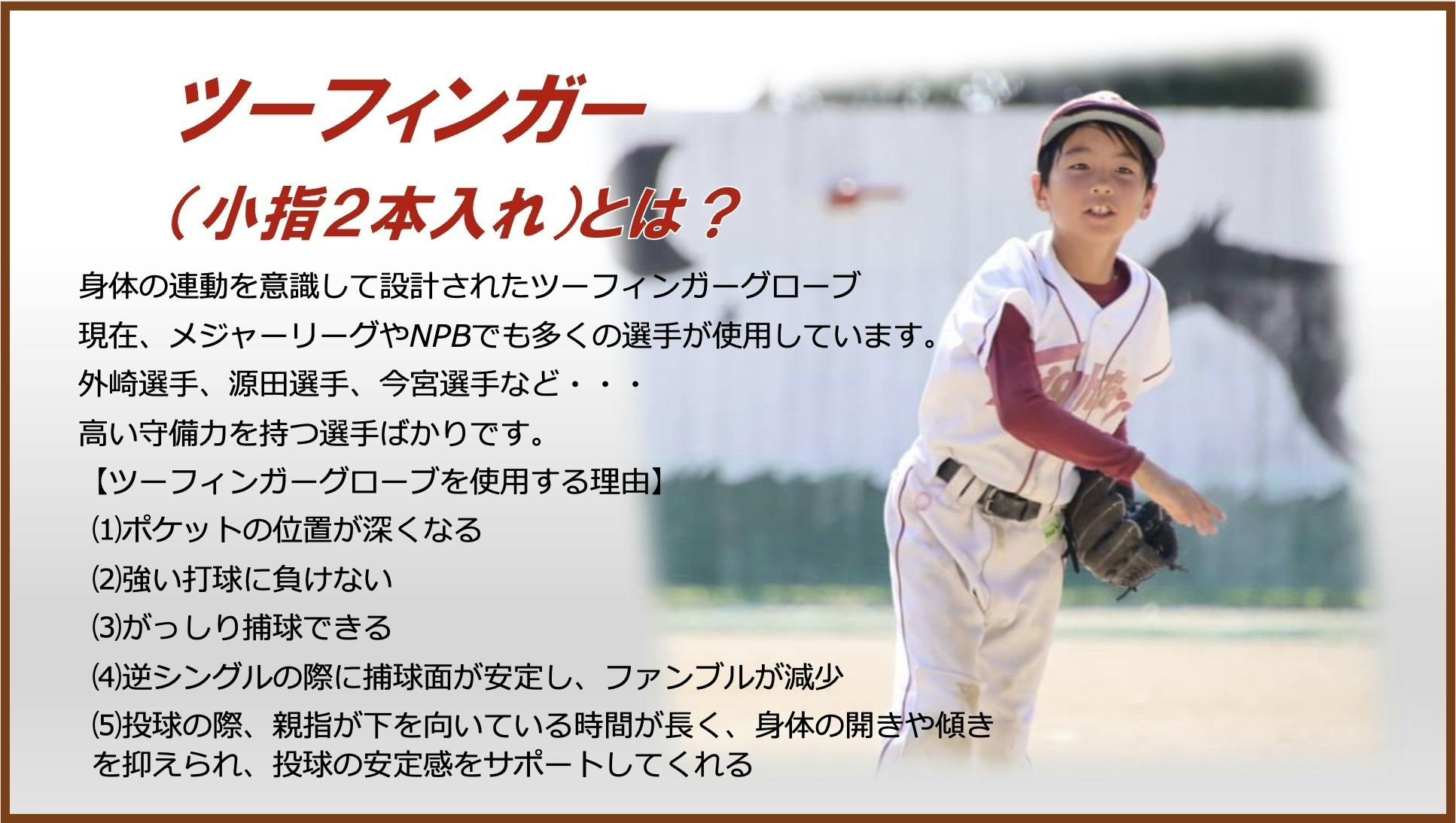 このグローブは誰が使っても取りやすいよう、捕球面(ポケット)を広く作り、ボールがグローブに入ると勝手に閉じてくれます。また、ツーフィンガー(小指2本入り)にすることにより、一般的なグローブより捕球時に力が入り、ポケットが深くなる為、ボールを掴みやすい設計となります。ボールをしっかりと包み込むのでエラーが少なくなり、より野球が楽しくなると思います。是非皆様にご使用いただけると幸いです。