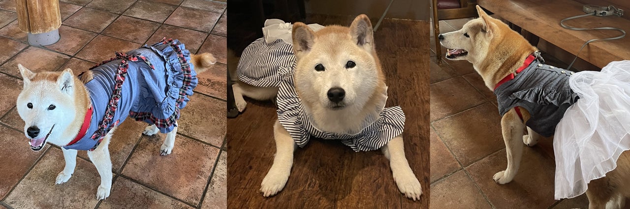 柴犬の標準より、少しだけサイズの大きい凛は、既成のサイズでは入りません。凛だけでなく、小型犬以上のサイズは現在の日本ではほぼ取り扱いがありません。辛うじて手に入るのは、収縮性のあるTシャツくらい。だから、ファッショナブルな小型犬と比較されるととても悲しい。嘆く私を憐れんで、仕事でお世話になっているドール服デザイナーの友人が数年前から凛専用のドレスを作ってくれるようになりました。 おかげで、ラグジュアリーなホテルのディナーでも臆することなく、胸を張って同伴を楽しんでいます。