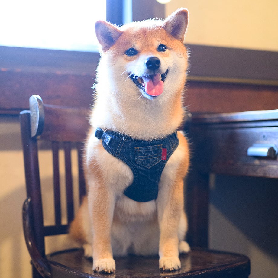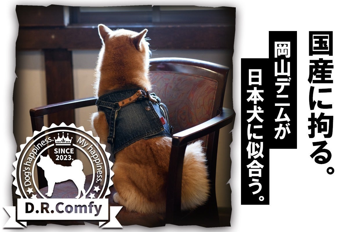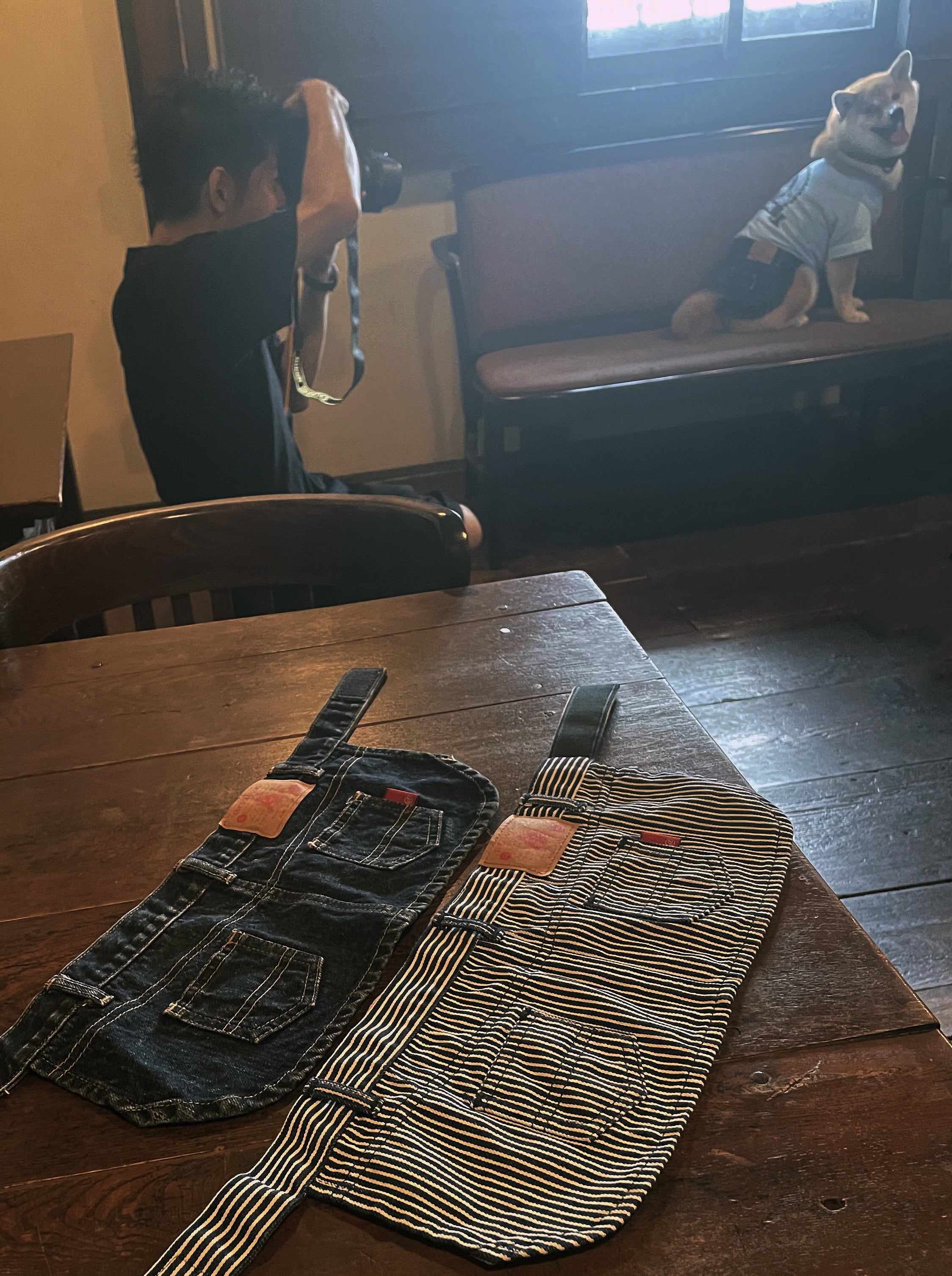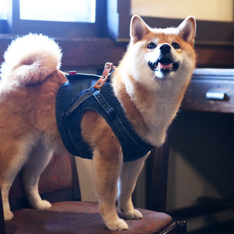 中型犬サイズの日本犬に似合う、国産の高品質にこだわったハーネスやベスト。人も羨む「岡山デニム」ならではの繊細さと歴史が醸し出す重厚感を意識した、妥協のない逸品作るために、担当責任者の方とZOOMやメールを何度もやり取りし、また出張でも直接お越しいただき、試行錯誤の末、ようやく完成しました。