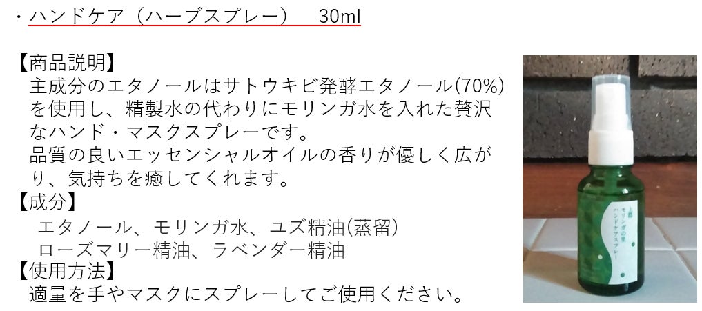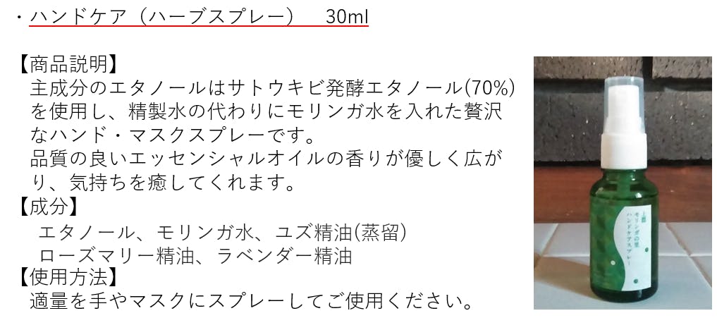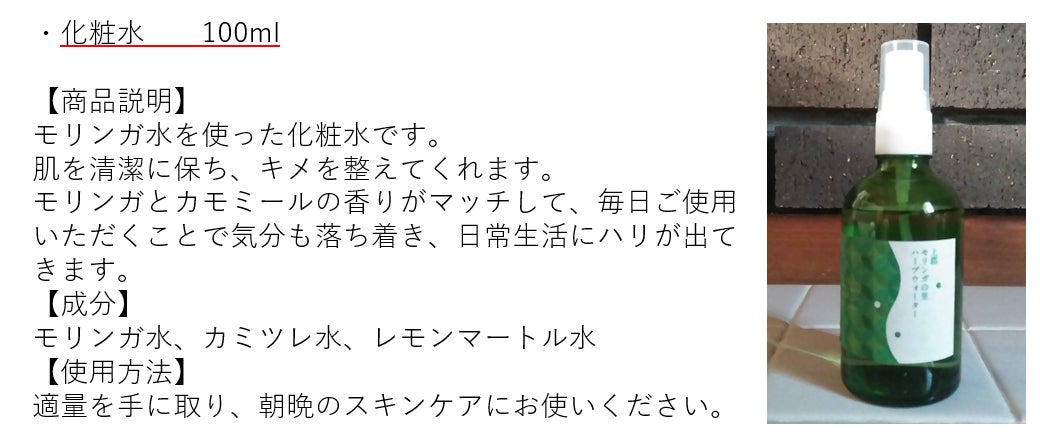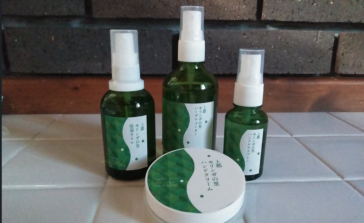 今回商品化しましたモリンガのハーブウォーター(化粧水)、ハーブオイル、ハーブクリーム、ハーブ石鹸、ハンドスプレーをご紹介します。