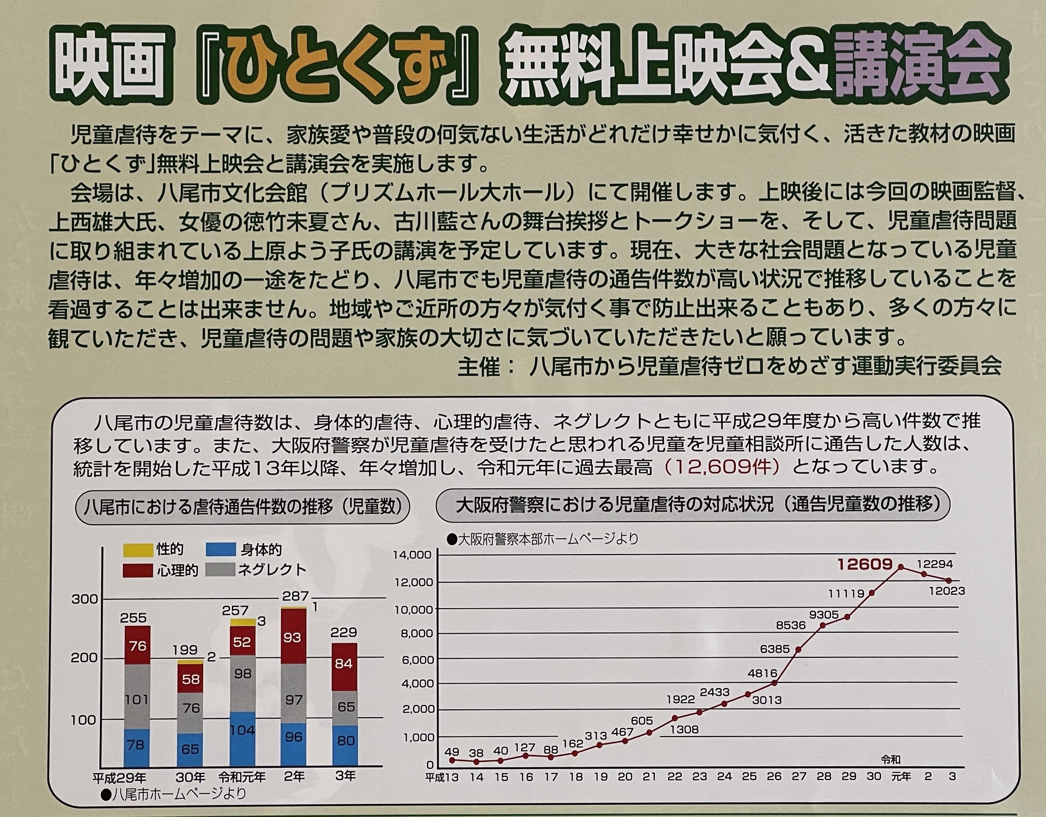 そしてこの上映会で終わりではなく、これをスタートとして地域の大人、民間企業と行政・学校が連携して必ず「八尾から児童虐待をゼロにする運動」につなげます。応援よろしくお願いします。