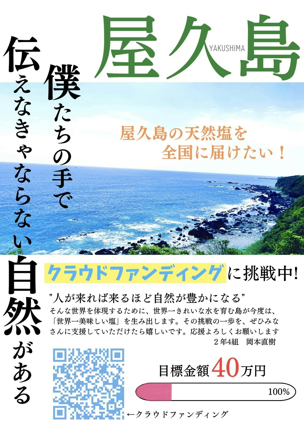 支援してくださった方、これから支援してくださる方の支援を無駄にすることなく、絶対にこのプロジェクトを成功させたいと思います。そして、世界中の人が屋久島の塩「海十日」を欲しいと思ってもらえるような、そんな塩を作りたいと思います。