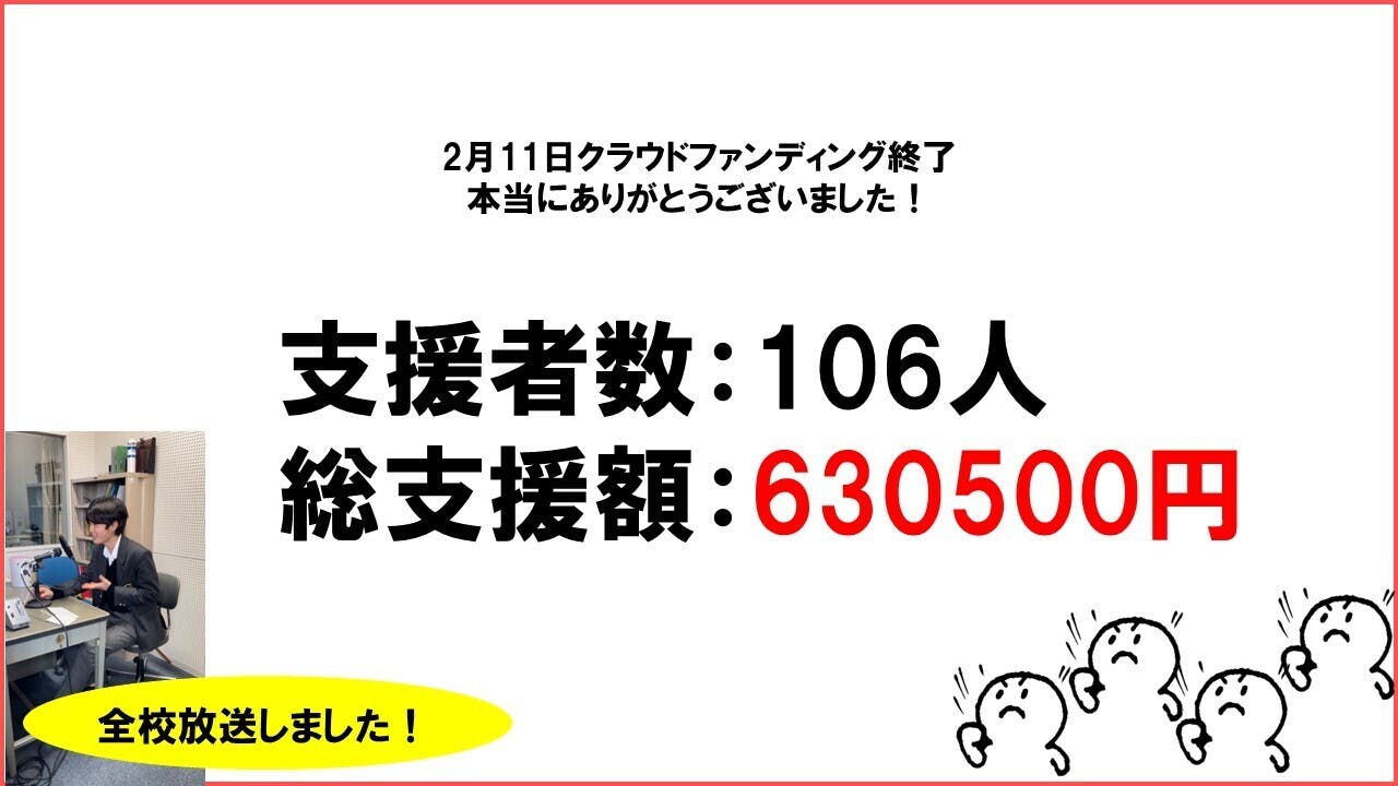 この度、2月11日をもってクラウドファンディングが支援者数は106人、総支援額は630500円で終了する形となりました。