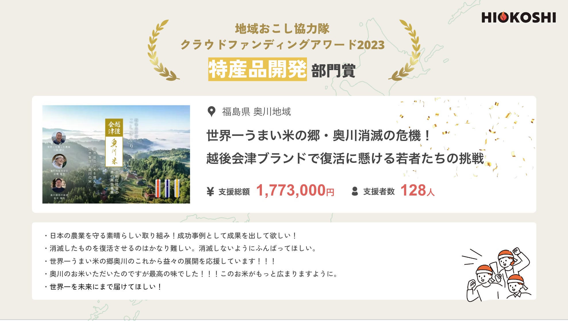数あるプロジェクトで【特産品開発部門】で最終的に残った3プロジェクトの中から、越後会津奥川米プロジェクトが何と部門賞を受賞しました!評価された内容としては、多くの支援者・協力者と共に地域一丸となって協働をしたことが最も評価されました。このプロジェクトは長谷川・櫻井の2人で実現したモノではなく、プロジェクトページにも名前を挙げさせて頂いている地元の方々や”結”でつながった関係人口の皆々様のご支援・協力あってのことです。この場で改めて感謝申し上げます。