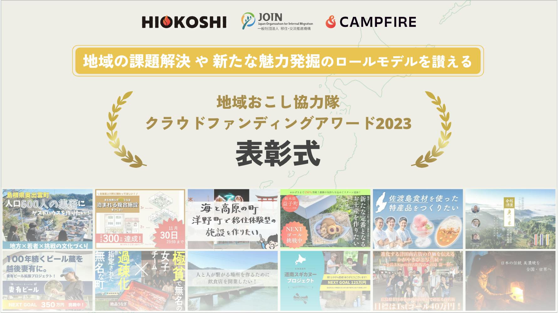 先週1月14日(日)に【JOIN 移住・交流&地域おこしフェア2024】にて、株式会社CAMPFIREと一般社団法人 移住・交流推進機構(以下、JOIN)が運営する地域おこし協力隊向けクラウドファンディング「HIOKOSHI(ヒオコシ)」で2023年に実施された地域おこし協力隊によるプロジェクトを表彰する「地域おこし協力隊クラウドファンディングアワード2023」 がオンライン形式で各部門ごとの授賞式が行なわれました。