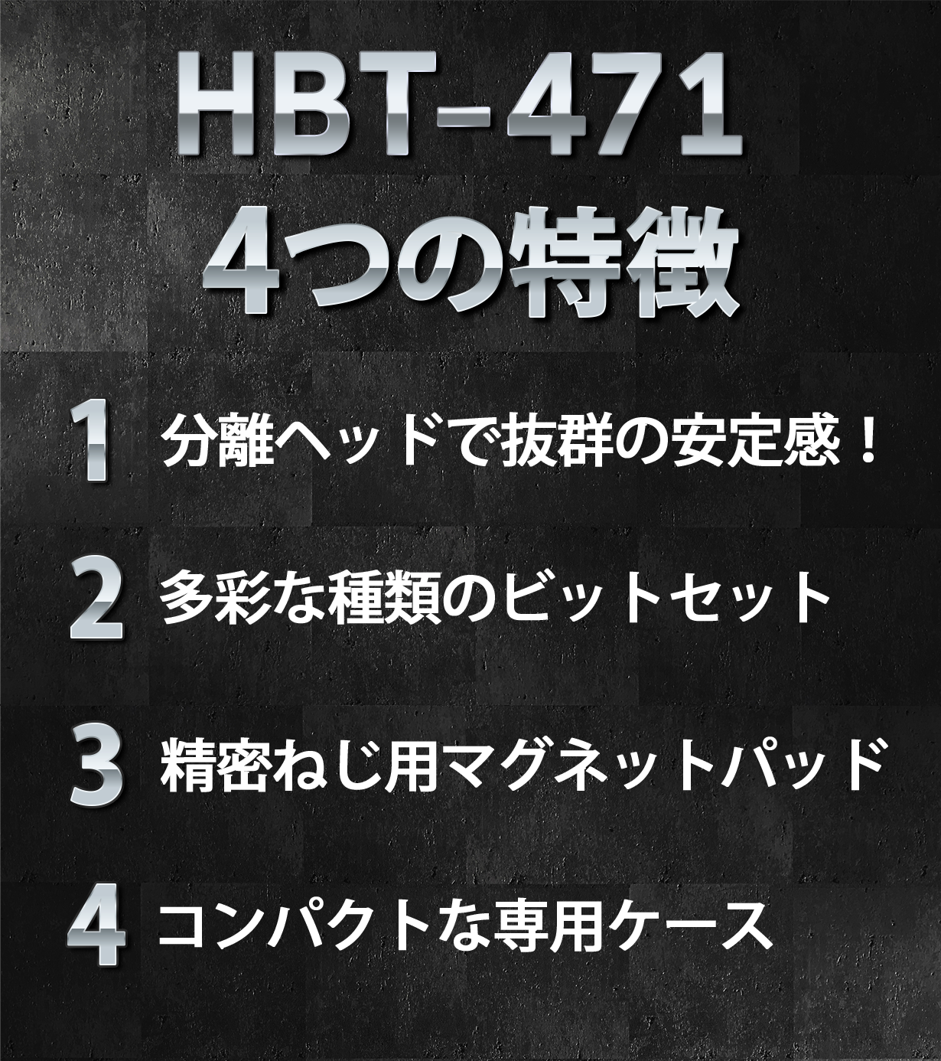 シンプルなケースには、ドライバー本体だけでなくエクステンションロッドやマグネットパッドなど付属品を全て収めて簡単に収納し、持ち運ぶことができます。精密機器に使うドライバーだからこそ、コントロールしやすく安定性の高いものが必要になります。HBT-471はヘッドを支えてブレなく正確にコントロールでき、ねじや機器の損傷を防ぎます。