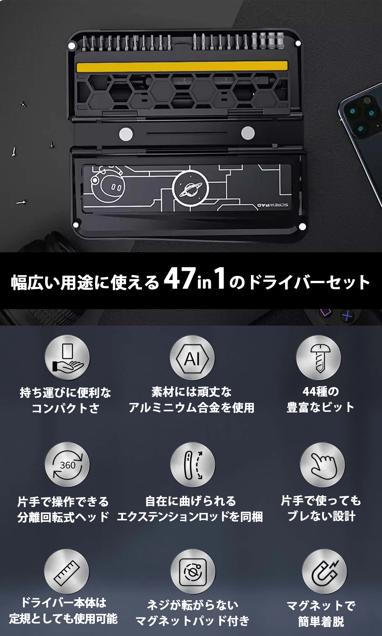 逆さでもねじの落ちないマグネット式のパットはケースに入れて持ち運べるので自宅以外でもねじ紛失を防ぎます。