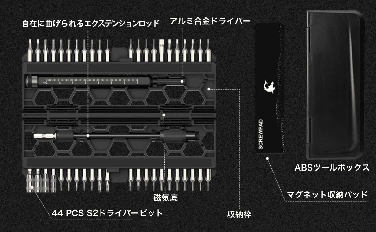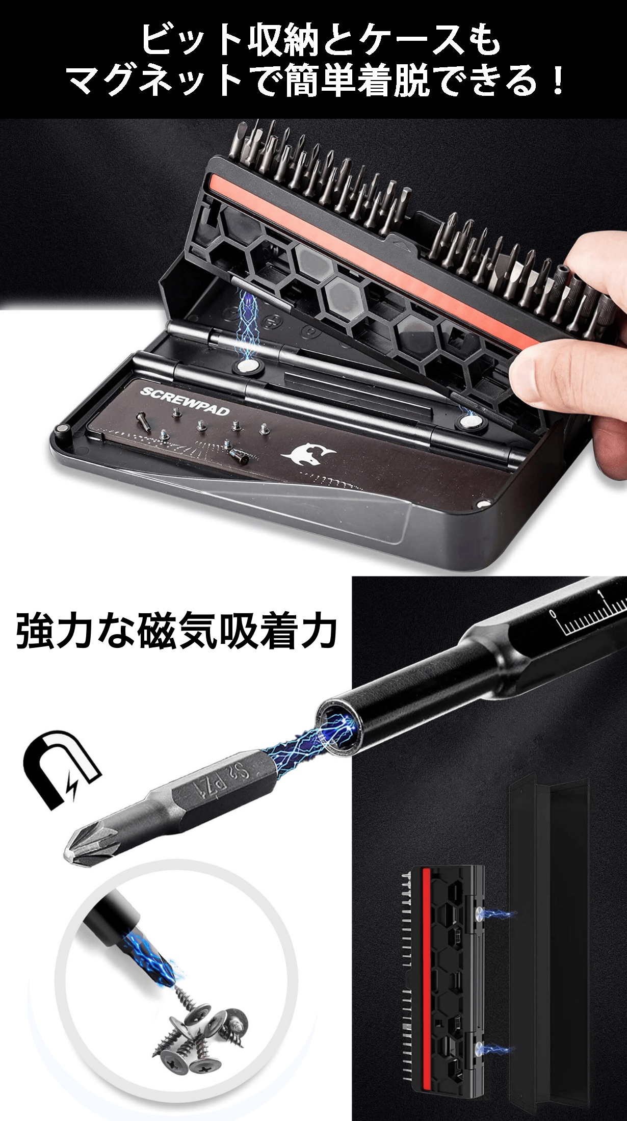 ケースやビットは強力磁力でしっかり接続できます。ビットの磁力を調節したくなったらマグネタイザーで簡単に調節できます!