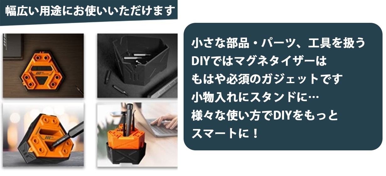 HBT-471&X-Magic Cubeは磁力をコントロールするほかに収納にもなる多機能マグネタイザー。この2つのセットでマグネットを自在に扱い、もっと快適なDIYを楽しんでいただきたく起案させていただきました。