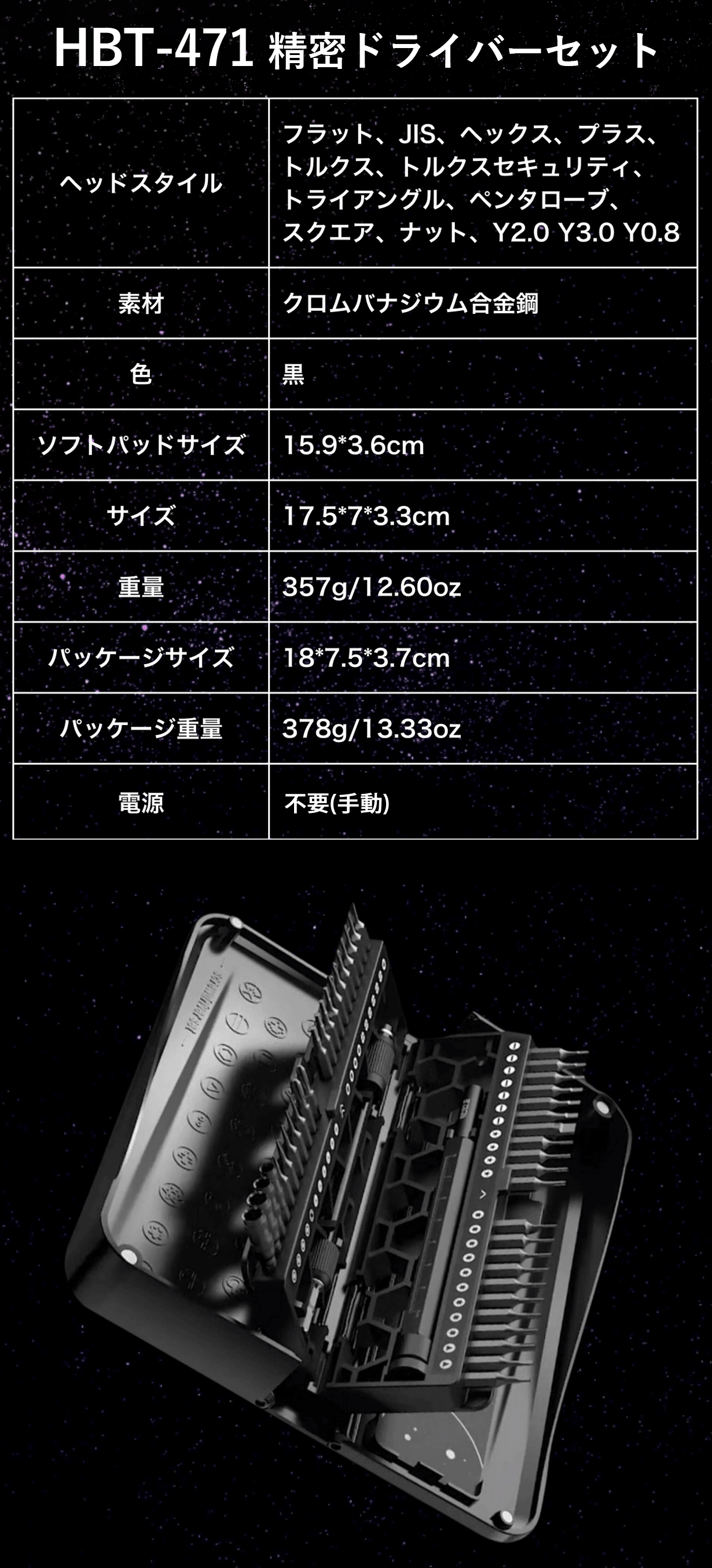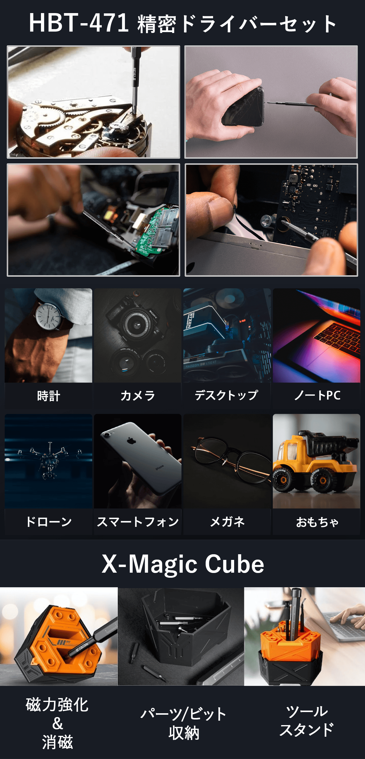 HBT-471&X-Magic Cubeはマグネットを上手く利用し、作業しやすいツールを揃えた高品質精密ドライバー&マグネタイザーセットです。