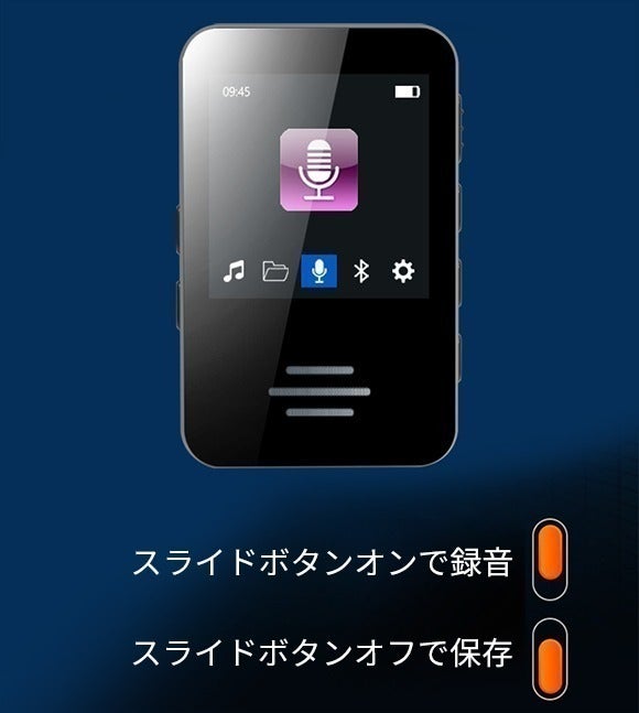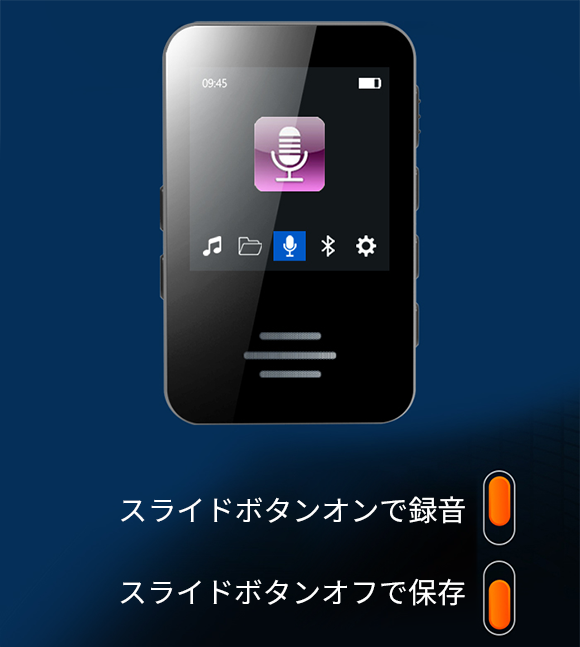 本体の右側のスライドスイッチで簡単に録音/保存を切り替えることができます。スイッチをRECにスライドすると、「A2」は自動的に録音を開始します。スイッチをSAVEにすると「A2」は録音した内容を自動保存して待機します。