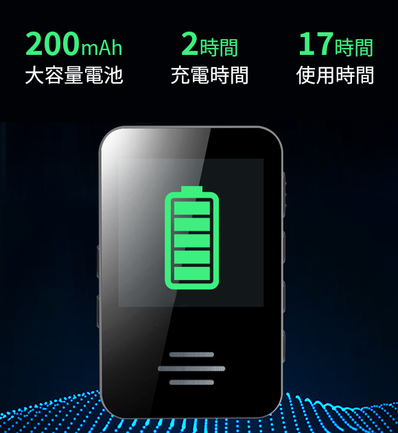 「A2」は200mAhのバッテリーを搭載しており、一度のフル充電で最大17時間の録音が可能です。Type-C急速充電に対応しており、フル充電には約2時間かかります。