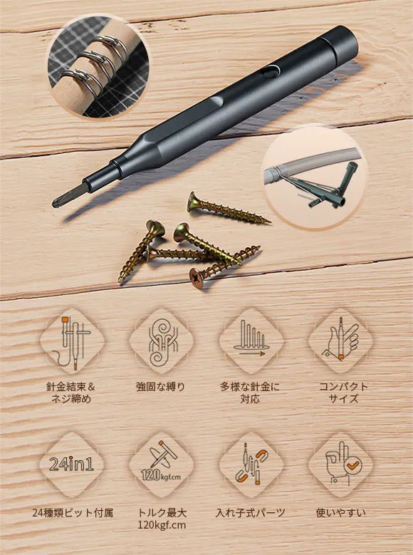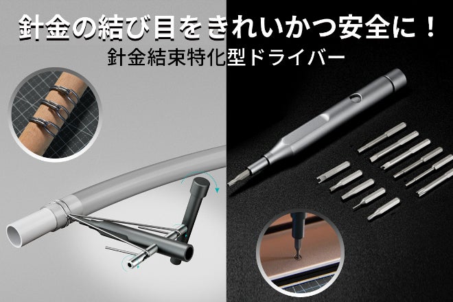 「Syinno SE」は針金結束とネジ締めの2つの機能を持ち、様々なシーンで活躍できるインドア&アウトドア両用のビットドライバーです。「Syinno SE」を使えば、針金をより簡単に結束できるだけではなく、高トルクでネジを締めたり、緩めたりすることも可能!