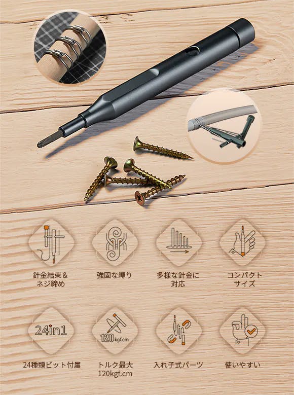 「Syinno SE」の付属品として、家庭用のほとんどのニーズに対応できる24種類のビットを用意しました。パーツの組み合わせでT型ドライバーに変形した「Syinno SE」は直径が細いペン型ドライバーより握りやすく、超高トルクで簡単かつ迅速にネジを締める・緩めることが可能。