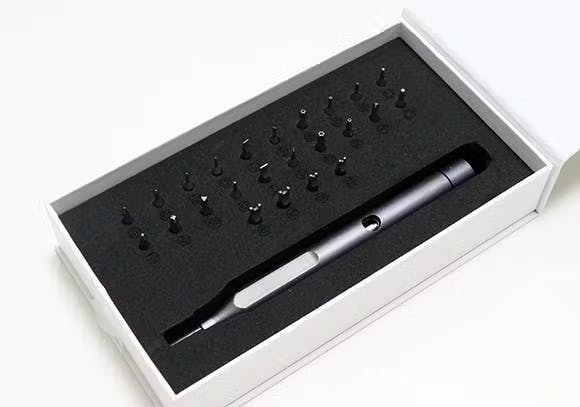 「Syinno SE」にはパソコンの分解から大工まで幅広く使える24種類のビットが収納ケースと共に付属しています。さらに、ビットの取り付けも着脱の便利なマグネット式を採用。ハンドルの先端に押し込むだけで装着完了。強力なマグネットのおかげで「Syinno SE」を強く振ってもビットが落ちないので、スムーズに作業することが可能。