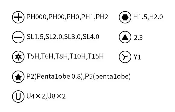 「Syinno SE」の付属品として、家庭用のほとんどのニーズに対応できる24種類のビットを用意しました。パーツの組み合わせでT型ドライバーに変形した「Syinno SE」は直径が細いペン型ドライバーより握りやすく、超高トルクで簡単かつ迅速にネジを締める・緩めることが可能。