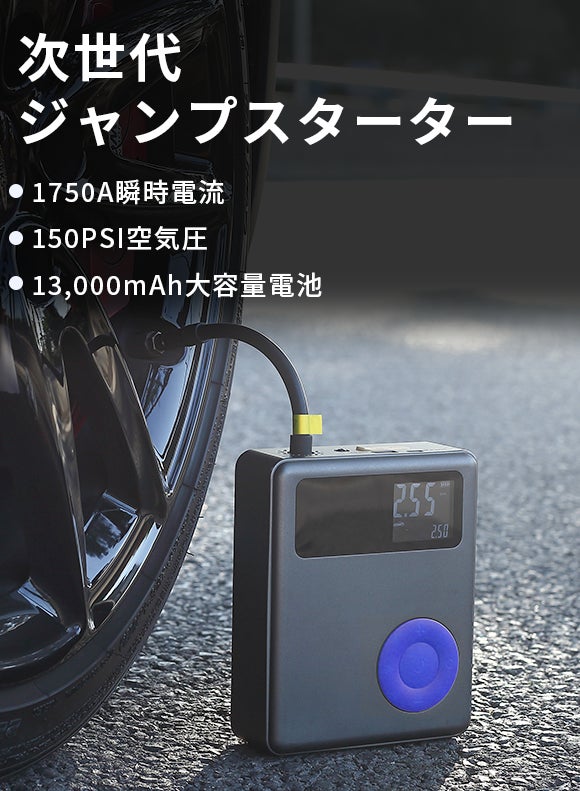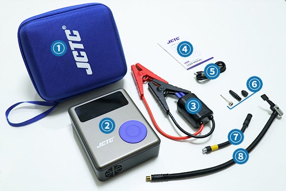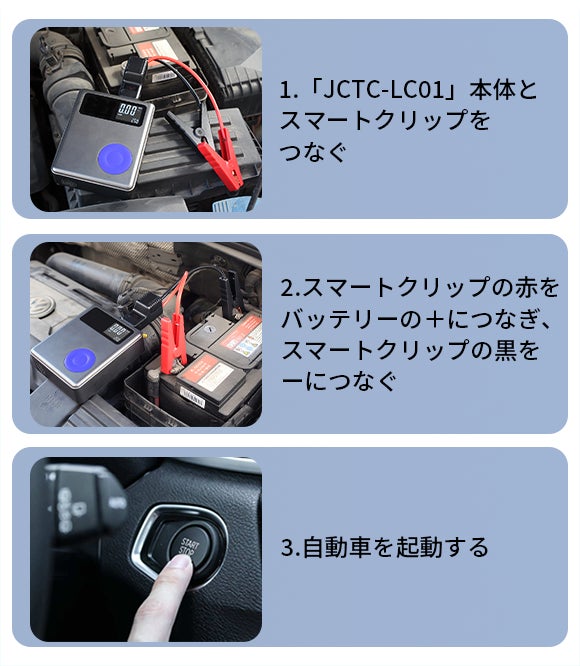 「JCTC-LC01」はバッテリー残量が少なくてエンジンが始動できない場合、迅速に電源を供給し、突然のバッテリー上がり問題を解決できる多機能ジャンプスターターです。さらに、電動エアポンプの機能も備えており、LEDデジタルディスプレイ搭載でタイヤ空気圧の状態も一目瞭然!