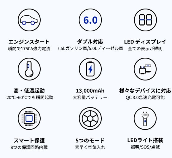 ・収納しやすい6 in1多機能設計!ジャンプスターター・空気入れ・タイヤ空気圧表示・照明・SOS・モバイルバッテリー機能をこれ1台でこなす!