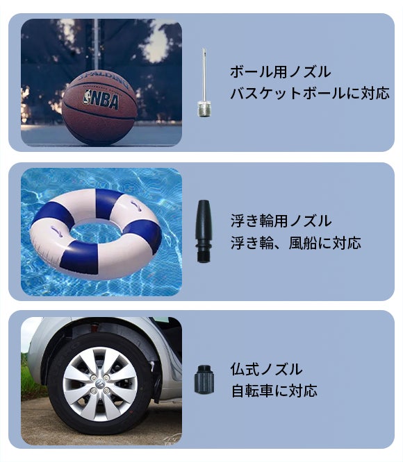 3種類のノズルが付属して、自動車、バイク、自転車やボールなど様々なシーンで大活躍します!