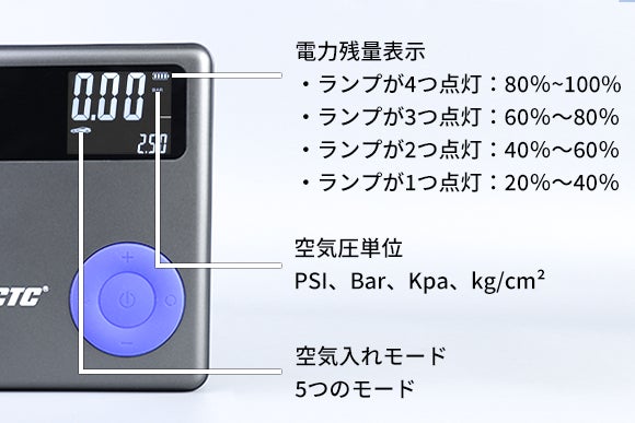 「JCTC-LC01」の空気流量は26L/minで、自動車、バイク、自転車、ボール、マニュアルの5つの空気入れモードがあり、様々なシーンで大活躍。ボタンを押すことで4つの空気圧単位(BAR、PSI、KPA、kg/c㎡)から選択できます。また、加圧・減圧で設定圧力を調整できます。「JCTC-LC01P」はモードを選択して空気入れを開始した後、設定された空気圧に達すると自動的に停止します。急を要する際に早く空気を入れてお悩みを解決します。