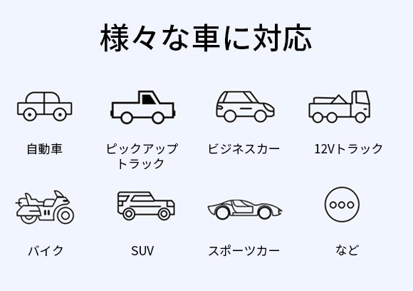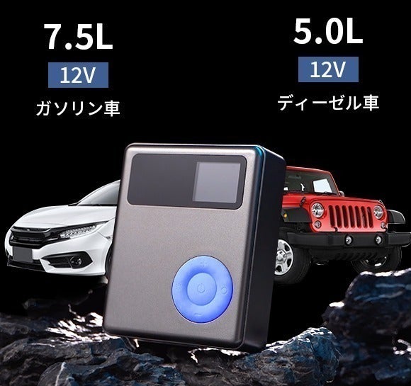 ジャンプスターターは12V/7.5L以内のガソリン車や12V/5.0L以内のディーゼル車に対応しております。