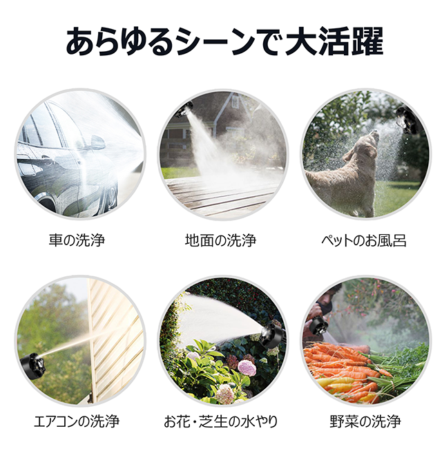 洗車、お花・芝生の水やり、野菜、ペット、屋外の壁・ガラスの洗浄など、様々なシーンで大活躍!