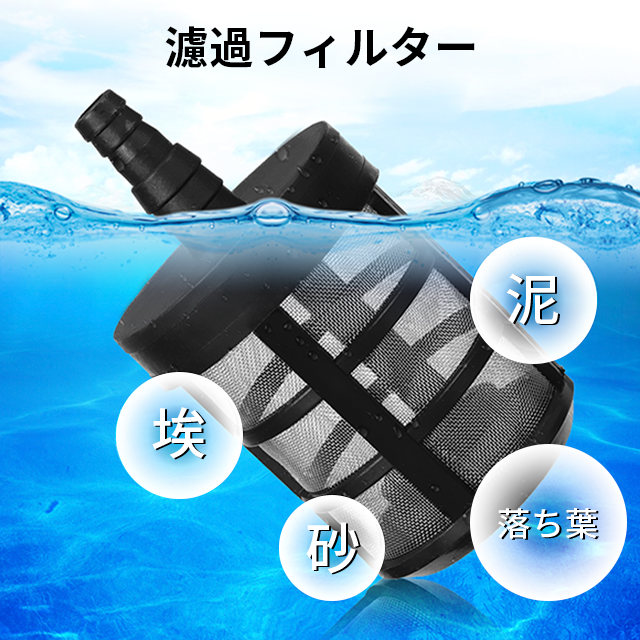 吸水ホースの長さは6m、さらにフィルター付きなので、埃、泥、砂、落ち葉などを取り除きます。雨水や池の水など使用可能なので、環境だけでなくお財布にも優しい設計です。