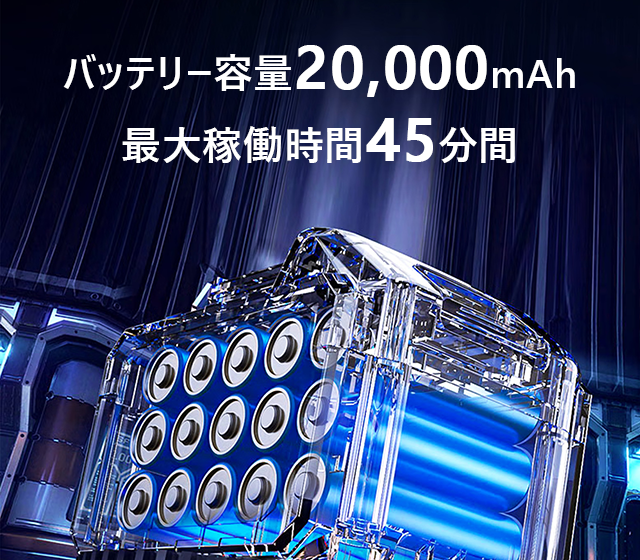 ・20,000mAhの大容量電池搭載、最大稼働時間は45分!