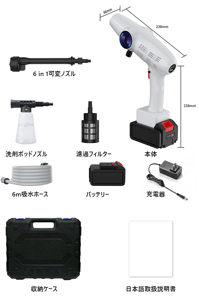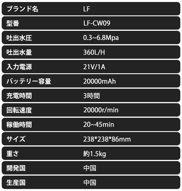 20,000mAhの超大容量バッテリーを内蔵しており、1回の充電で30~45分間作動できるので、楽々洗車を完了できます。