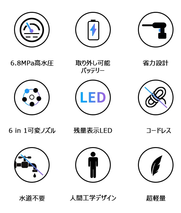軽量・コンパクトで取り外し式の20,000mAh大容量バッテリーを内蔵しており、さらに自吸式設計のため、電源や水道が近くにない場所でも使用できます!