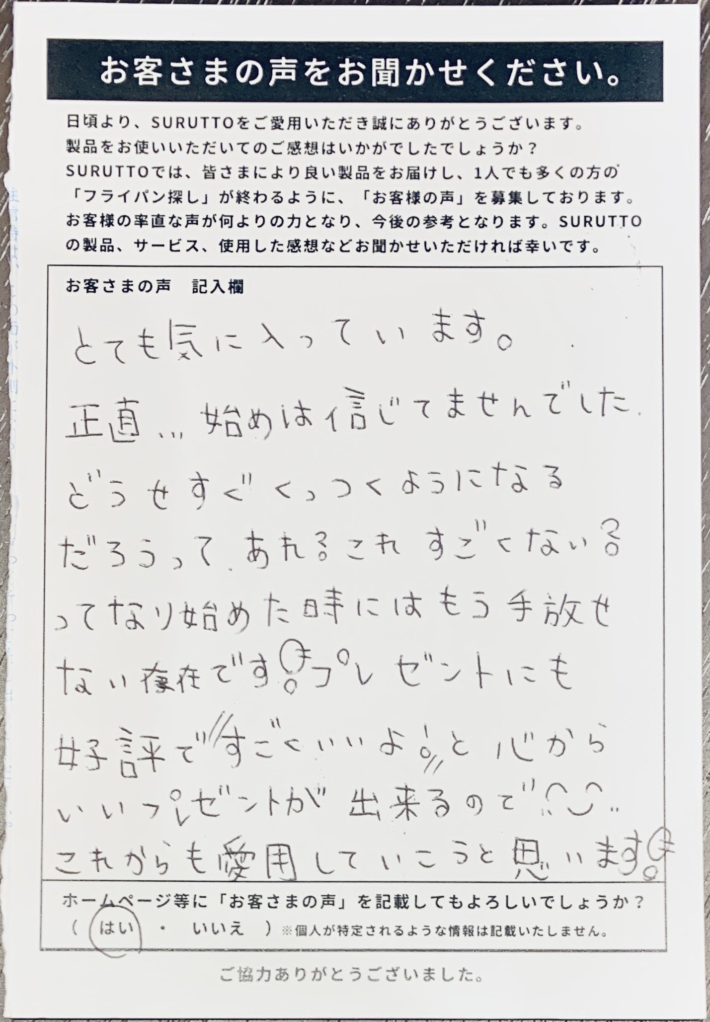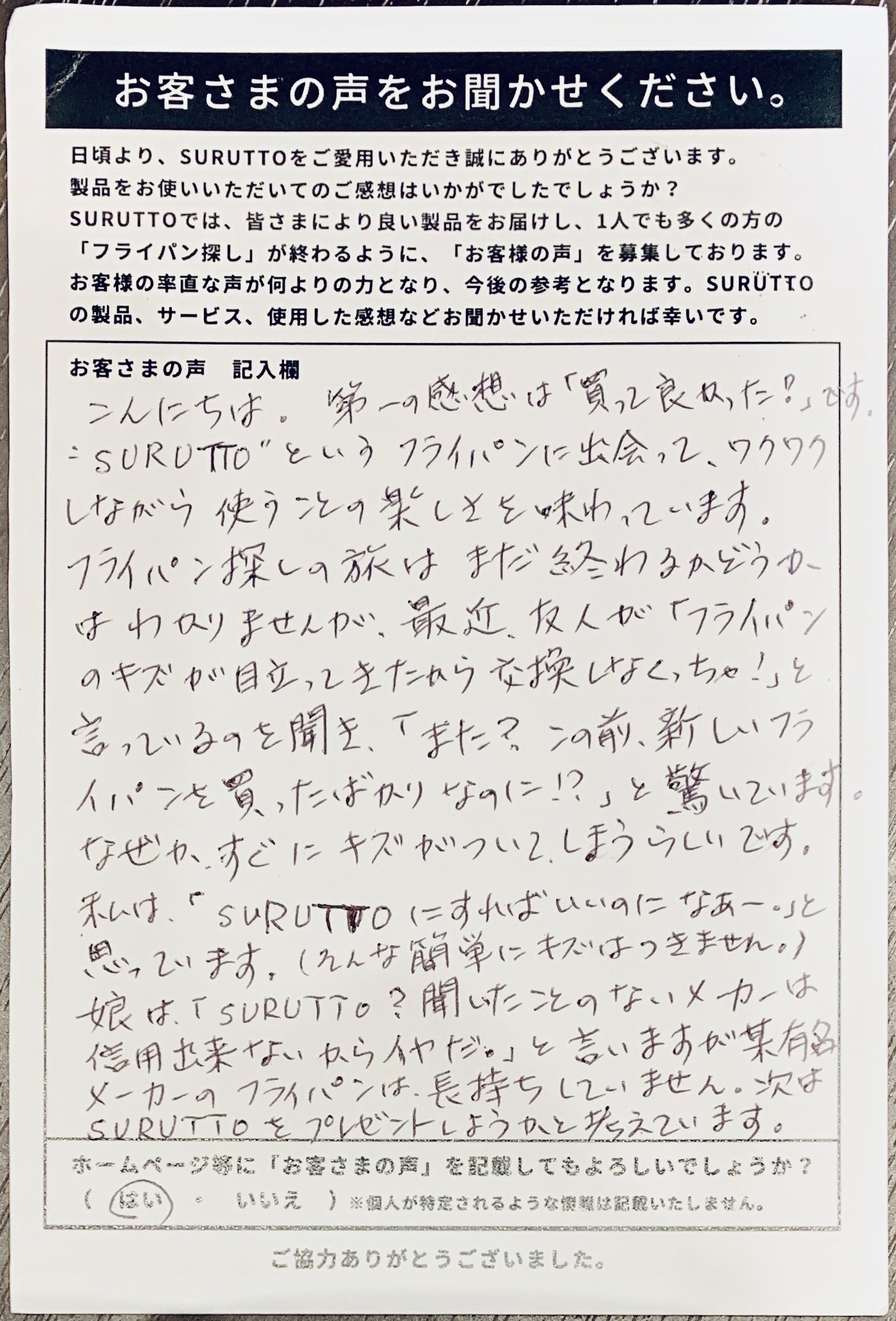 SURUTTOを手にした全てのお客さまが感動し、「やっと出会えた!これこそが私の求めていたフライパンだ!」と満足できる最高のフライパンでなければ、意味がない。そんな想いで、今まで開発を進めてきました。