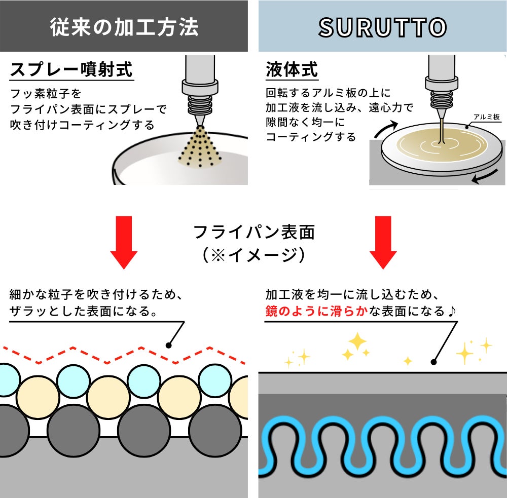 SURUTTOに使われる『WellFlon®スピンコーティング』というフッ素樹脂加工は、抜群のスルッと感が驚くほど長続き!