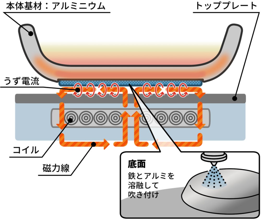 IH調理の際、食材に均一に熱が伝わるように底面の端ギリギリまで溶射加工がしてあります。