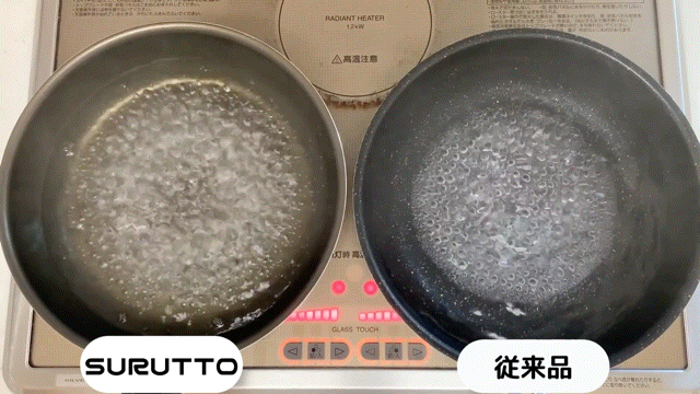 IH加熱の際、従来の貼り底品は、ステンレス部分しか加熱されないのに対し、SURUTTOは、底面全体が熱せられ、食材に均一に熱が伝わります。お湯を沸かすとSURUTTOは底面全体から沸騰した泡が発生しているのが分かります。