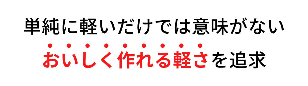 単純にフライパンの厚みを薄くすれば軽くなります。しかし、それでは蓄熱性が下がり、フライパン内の温度管理が難しくなり料理が作りにくい…、また、強度も不足するため、変形などにも弱くなってしまいます。かと言って厚みを出しすぎると重くて使いにくい…、SURUTTOは底面や側面の厚さを調整し、「おいしく作れる」「つかいやすい軽さ」「一定の強度の維持」を追求しました。