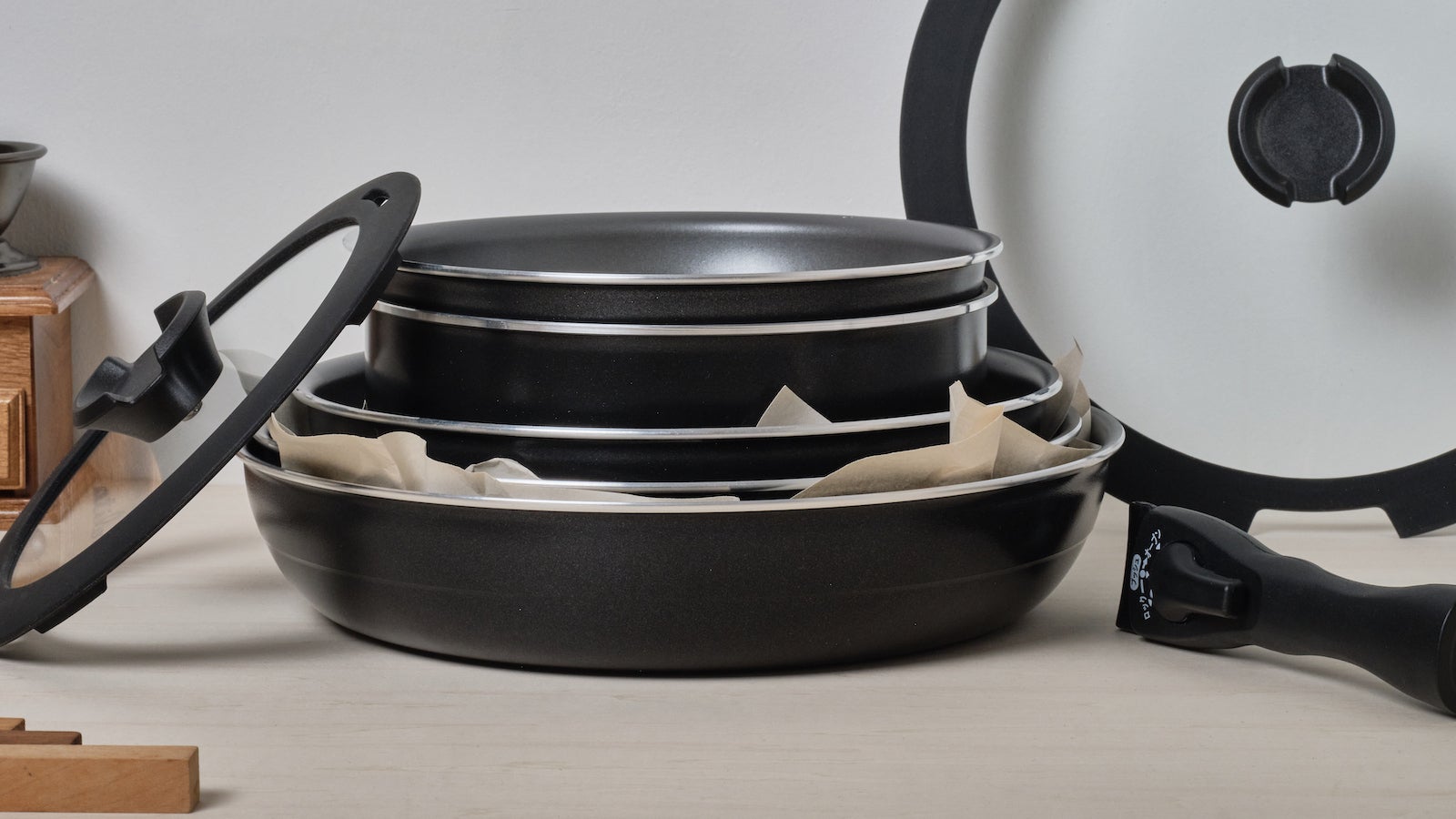 ※写真では下から「フライパン28cm」→「フライパン26cm」→「ディープパン24cm」→「ポット20cm」→「フライパン20cm」の順で重ねてあります