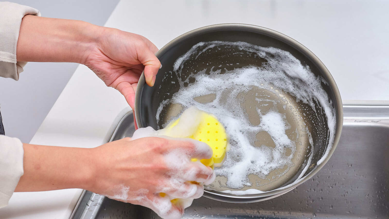 柔らかいスポンジと中性洗剤だけで、面倒なフライパン洗いが、まるで「お皿を洗うかのような手軽さ」になります。
