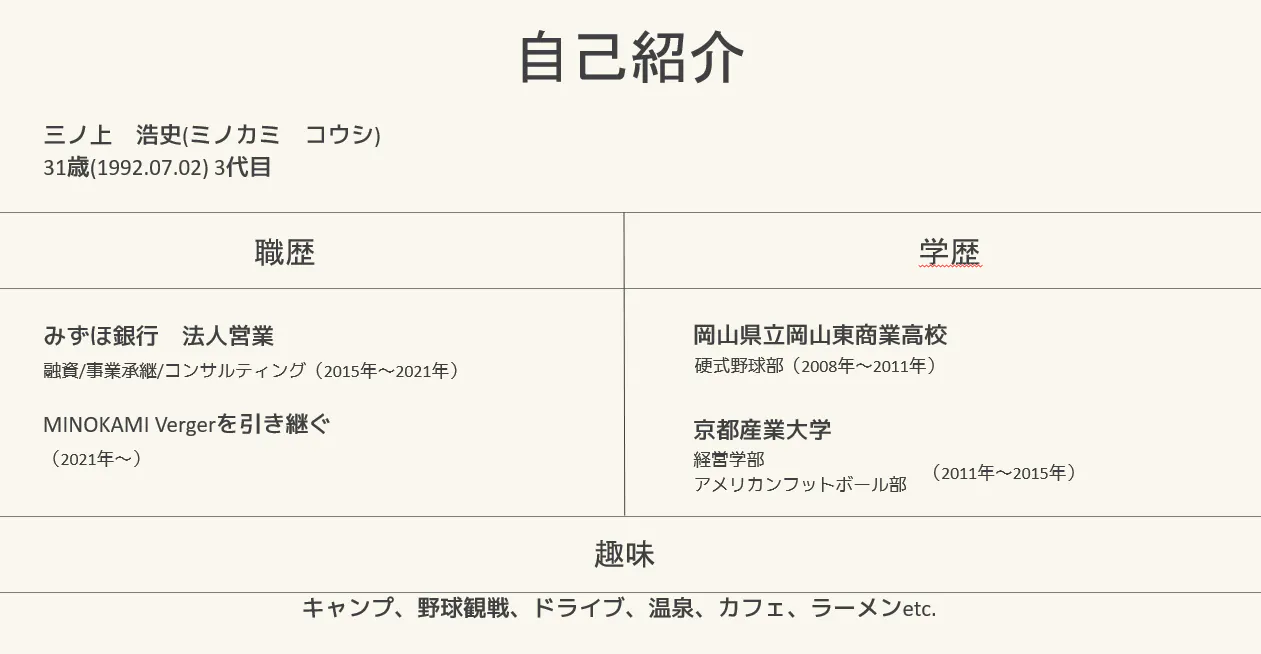 シャインマスカットの名産地、岡山県でMINOKAMI Vergerを経営しております、三ノ上 浩史と申します。