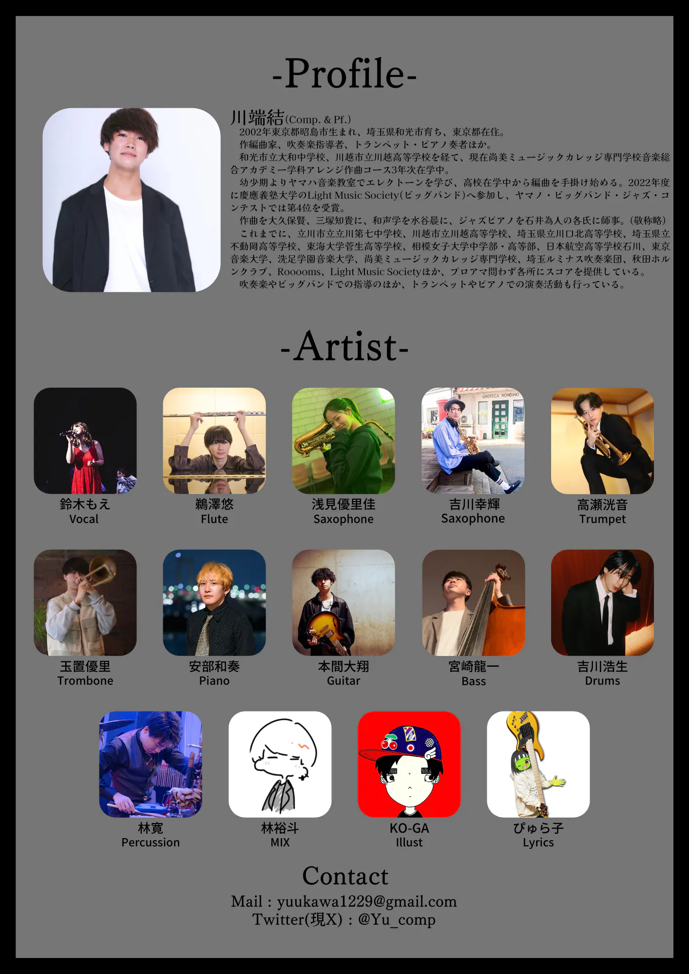幼少期からエレクトーンでJazzやFusionを、昨年度からは学バンに入り、たくさんのJazzに触れてきました。今までの音楽人生の集大成となる作品を皆様にお届けいたします。応援のほど、よろしくお願いいたします!!