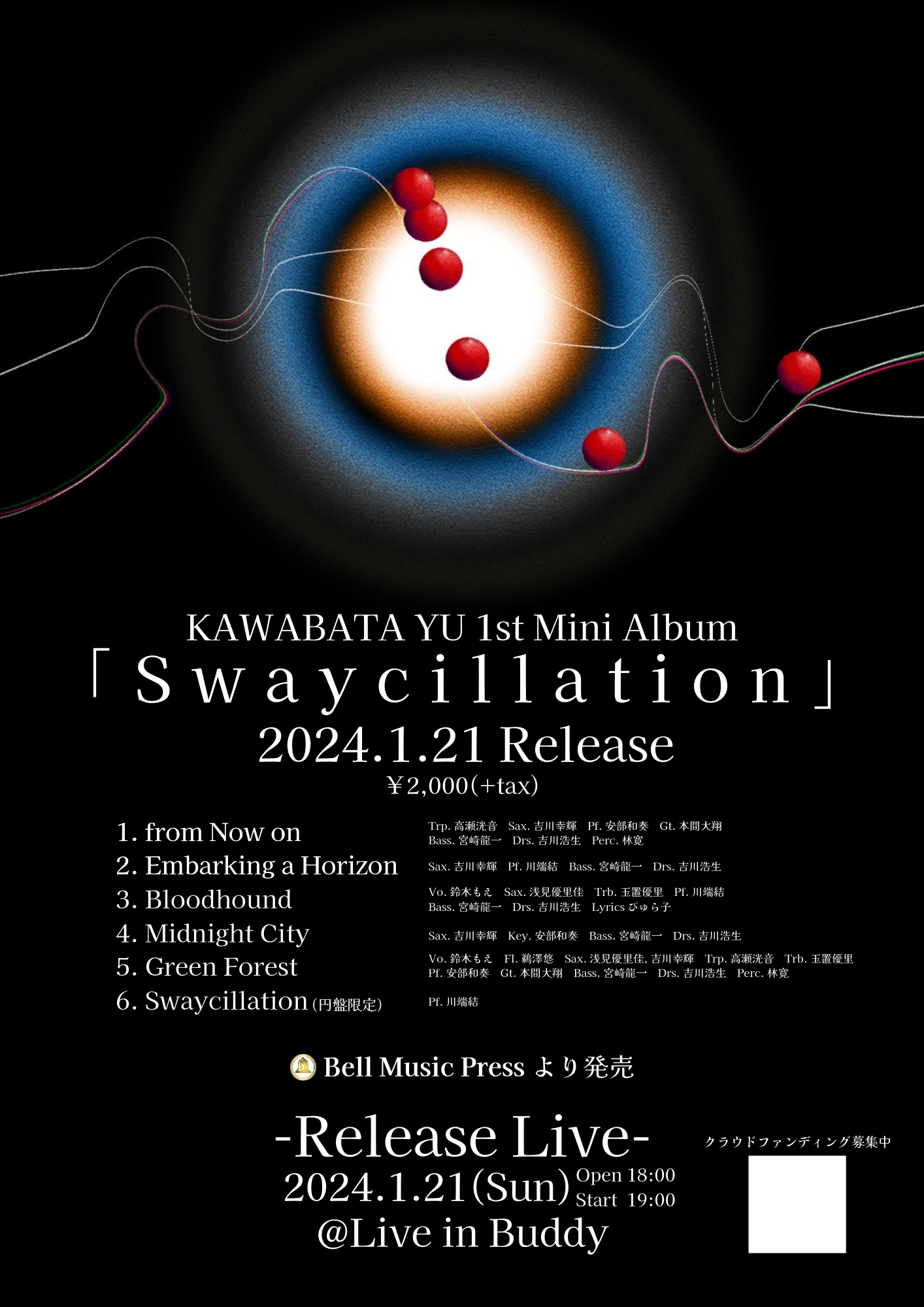 この度は、ミュージックストア・ジェイ・ピーさんが保有するレーベル、ベル・ミュージック・プレスより自身初のアルバム「Swaycillation」を発売することとなりました!全6曲収録のJazz Mini Albumとなっております。SwingやBalladeはもちろん、Contemporaryといったジャンルにも挑戦しました!