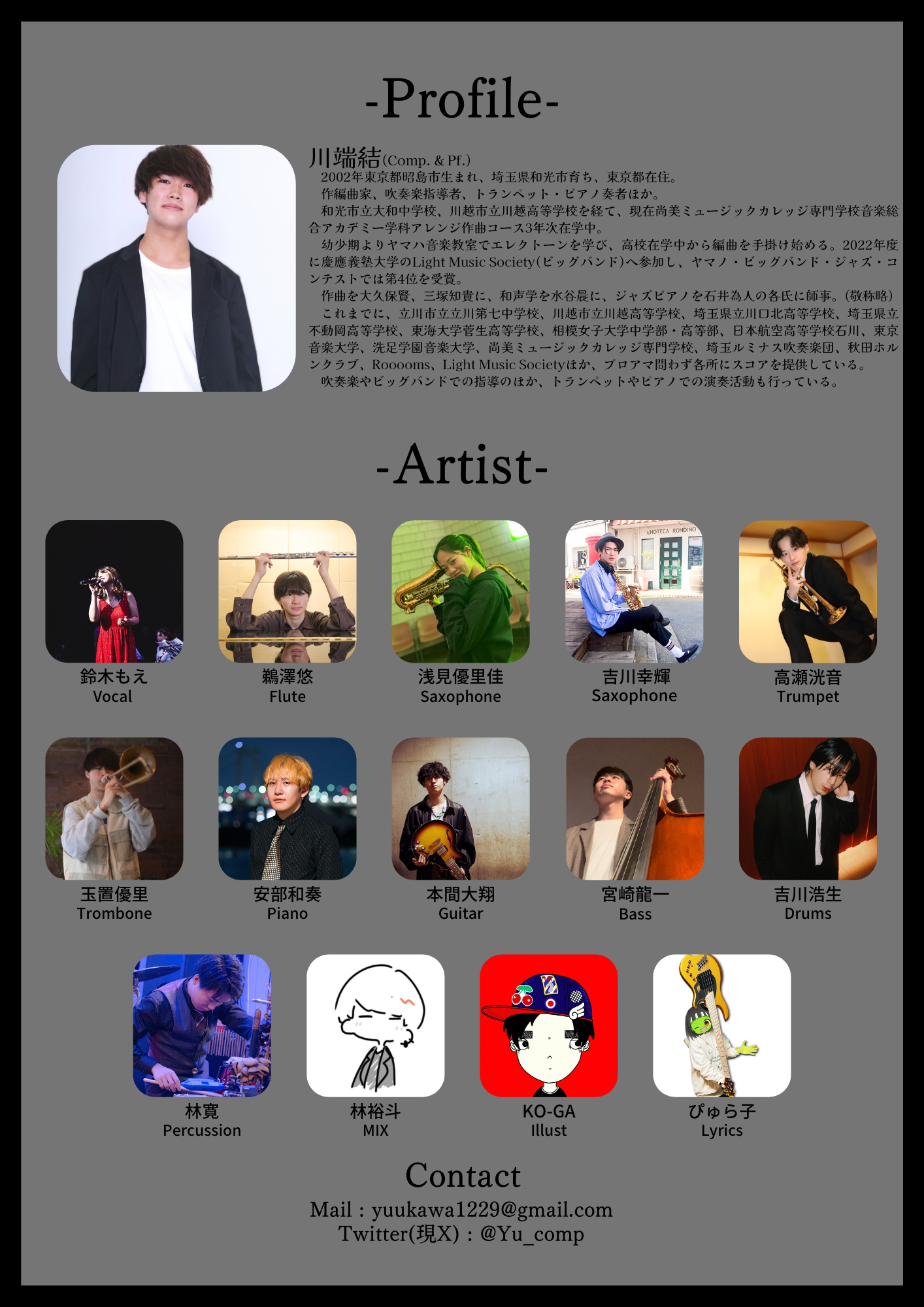 幼少期からエレクトーンでJazzやFusionを、昨年度からは学バンに入り、たくさんのJazzに触れてきました。今までの音楽人生の集大成となる作品を皆様にお届けいたします。応援のほど、よろしくお願いいたします!!