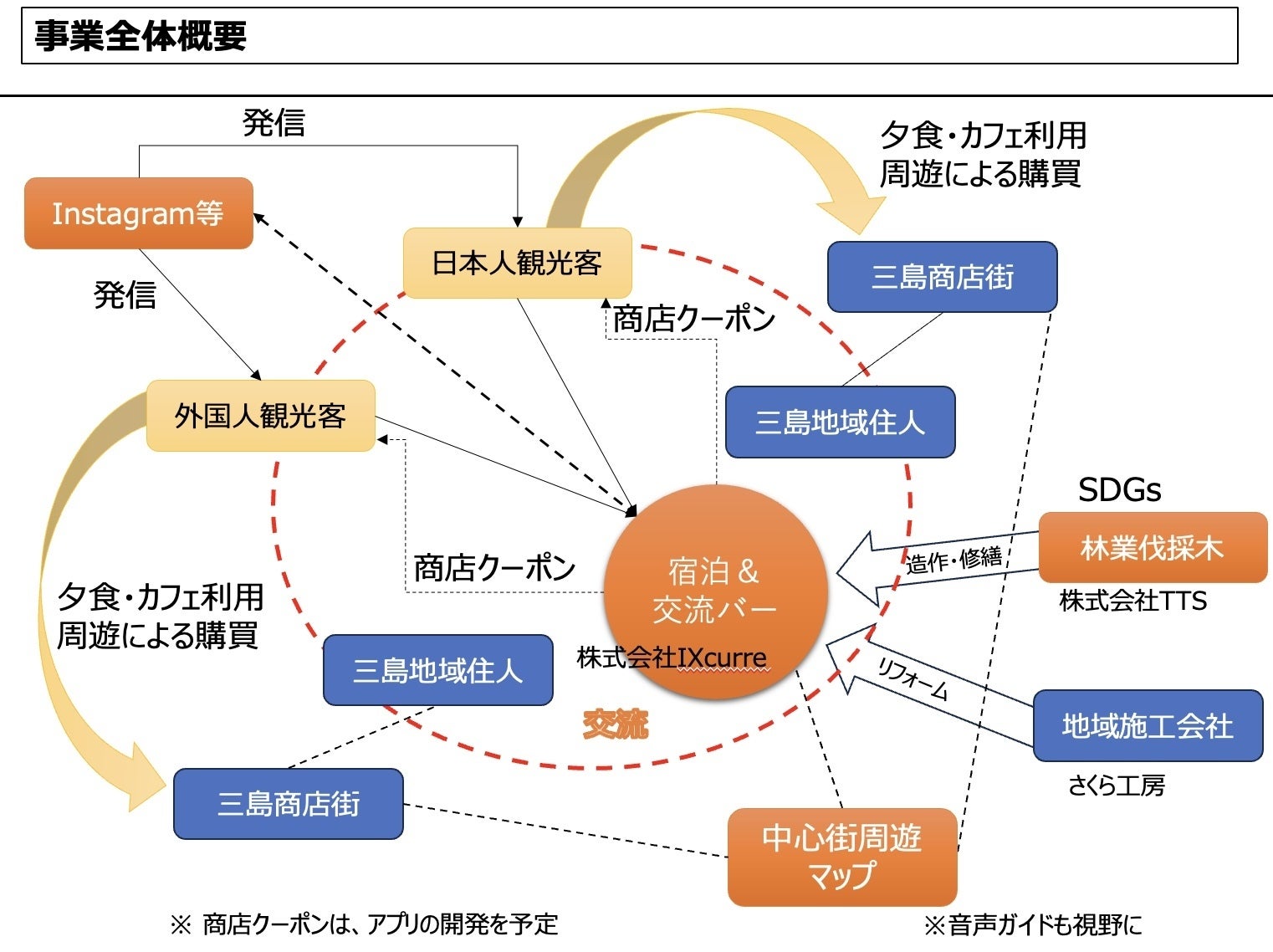 三島市の人口は、約11万人である他方、日本有数の観光地である伊豆半島や箱根・河口湖の玄関口として、677万人の観光来訪・通過(交流人口数)がある地域だが、宿泊客数は33万人(宿泊率4.87%/静岡県令和元年度 静岡県観光交流動向より)と少ない状況となっており、三島市特有の問題として表出している。