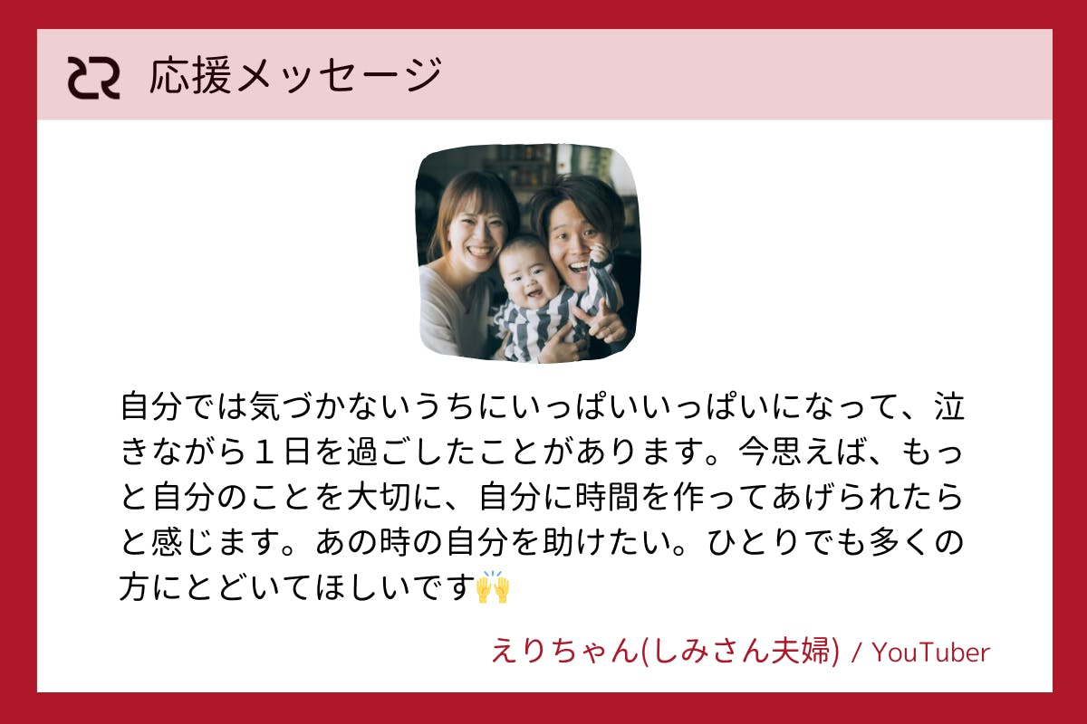 『 自分では気づかないうちにいっぱいいっぱいになって、泣きながら1日を過ごしたことがあります。今思えば、もっと自分のことを大切に、自分に時間を作ってあげられたらと感じます。あの時の自分を助けたい。ひとりでも多くの方に届いて欲しいです! 』